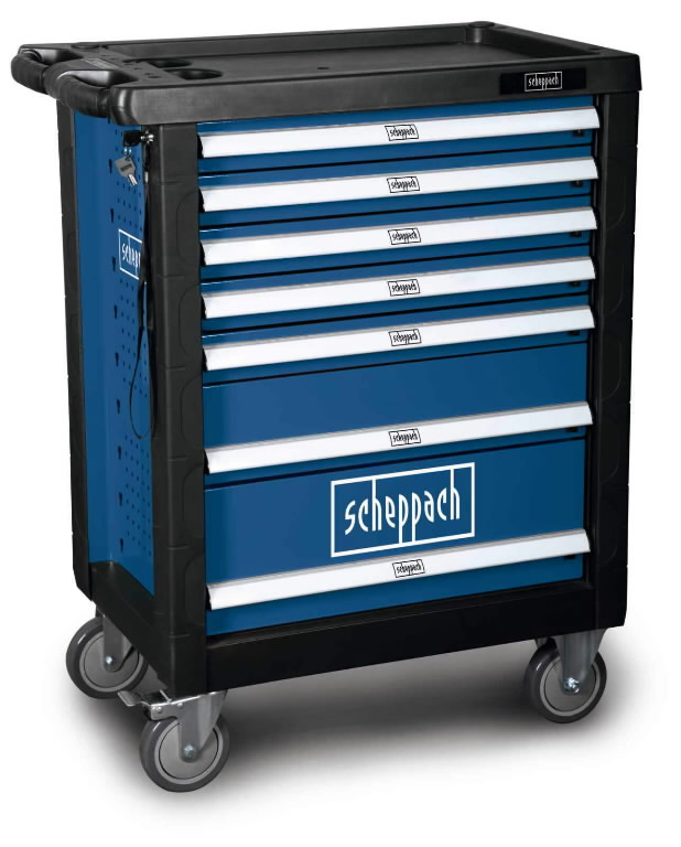 Tänu tugevale konstruktsioonile ja ratastele on Scheppach TW1000 tööriistakäru lihtne liigutada erinevates töökohtades. Seitsme avara sahtliga kapp võimaldab tööriistu mugavalt sorteerida ning kolm tühja sahtlit annavad võimaluse lisada ka oma tööriistu.